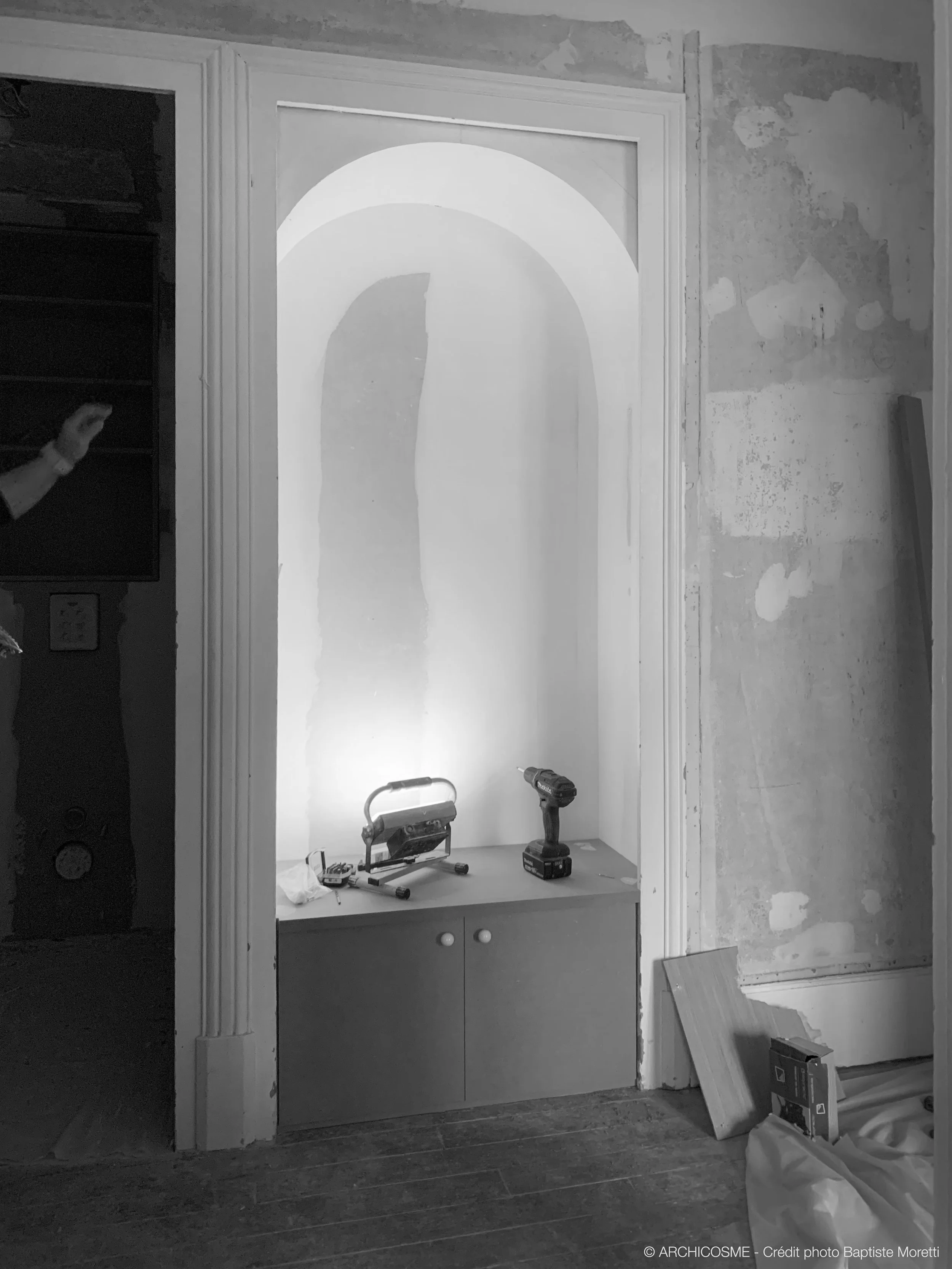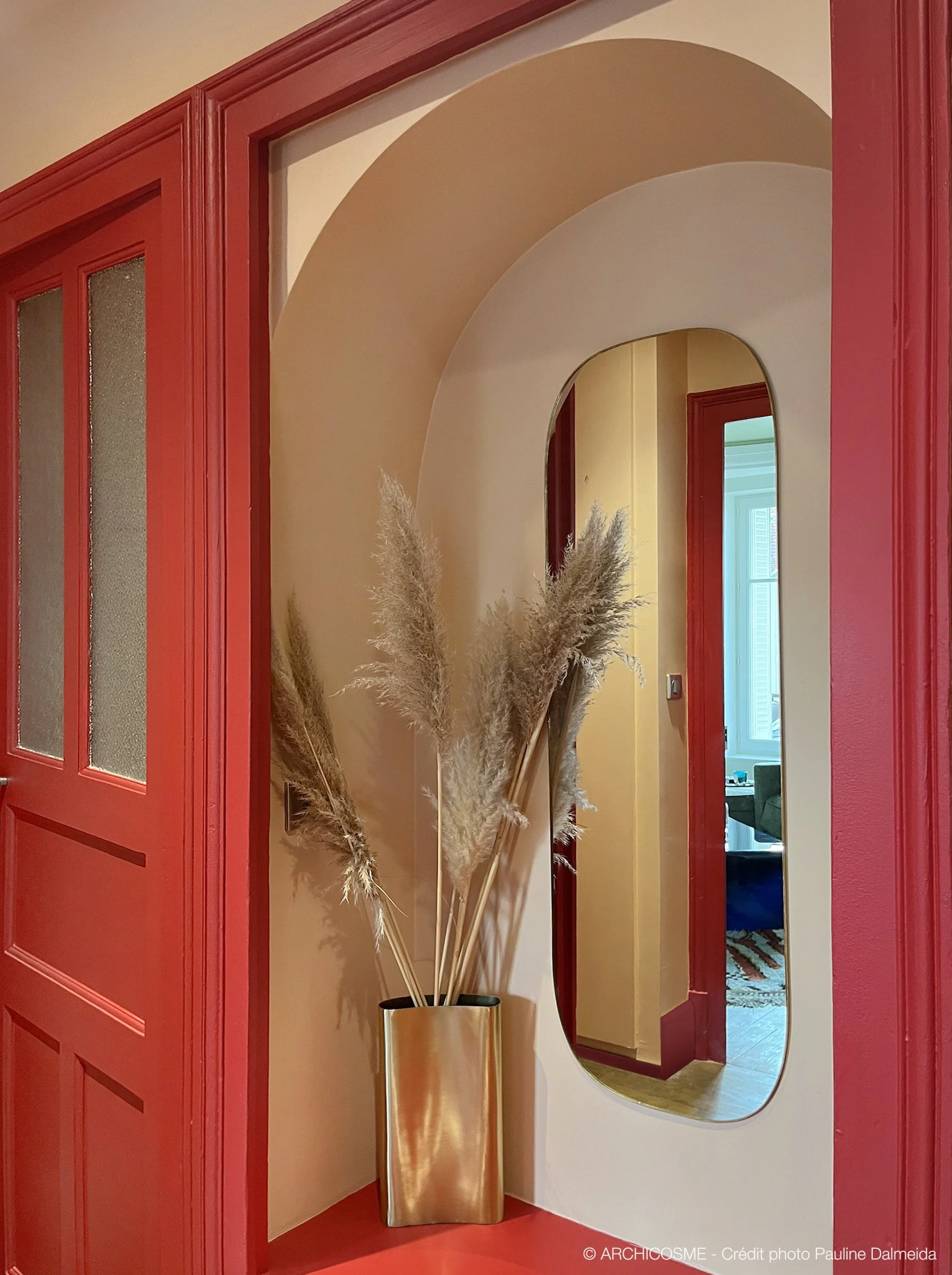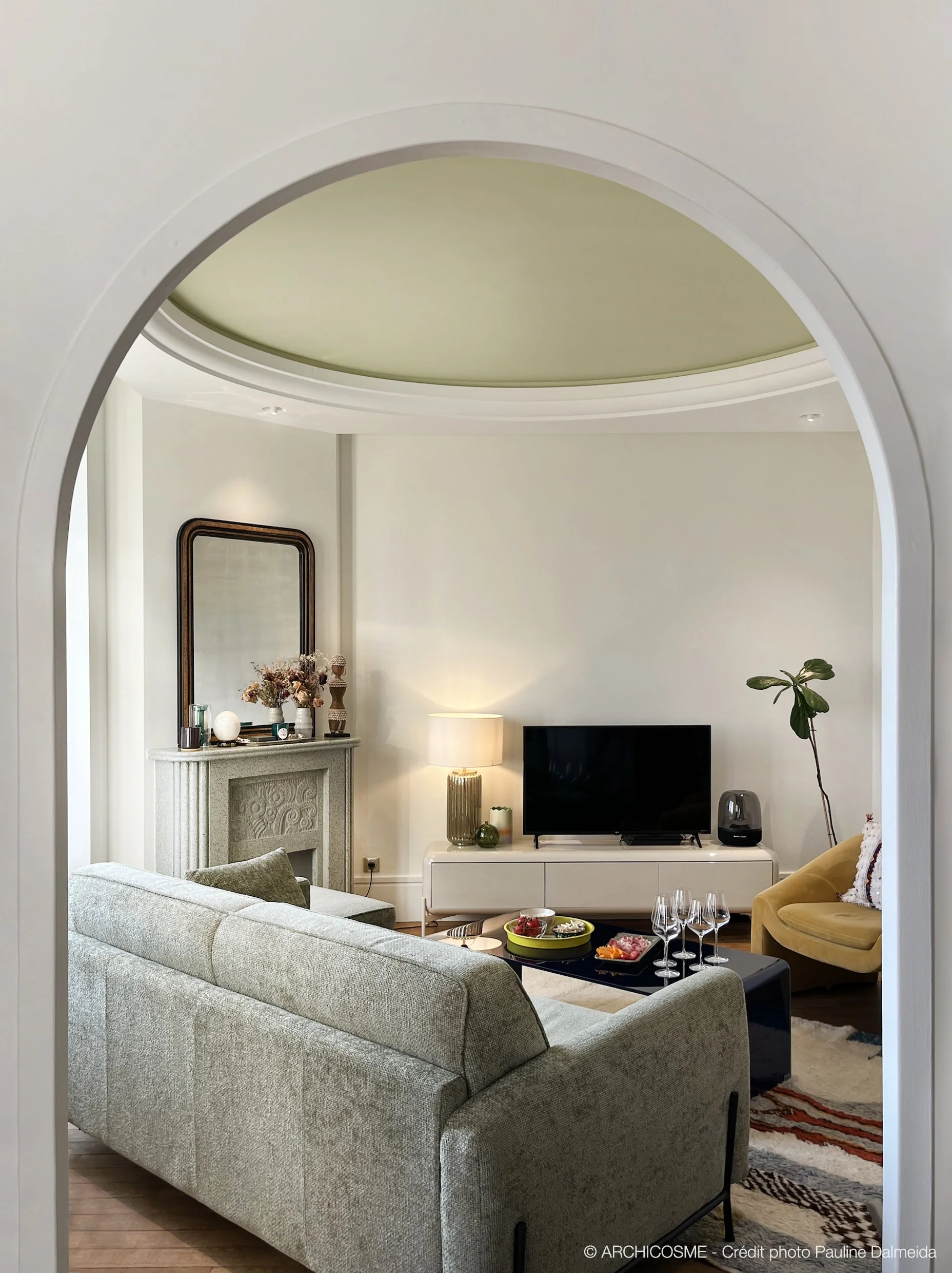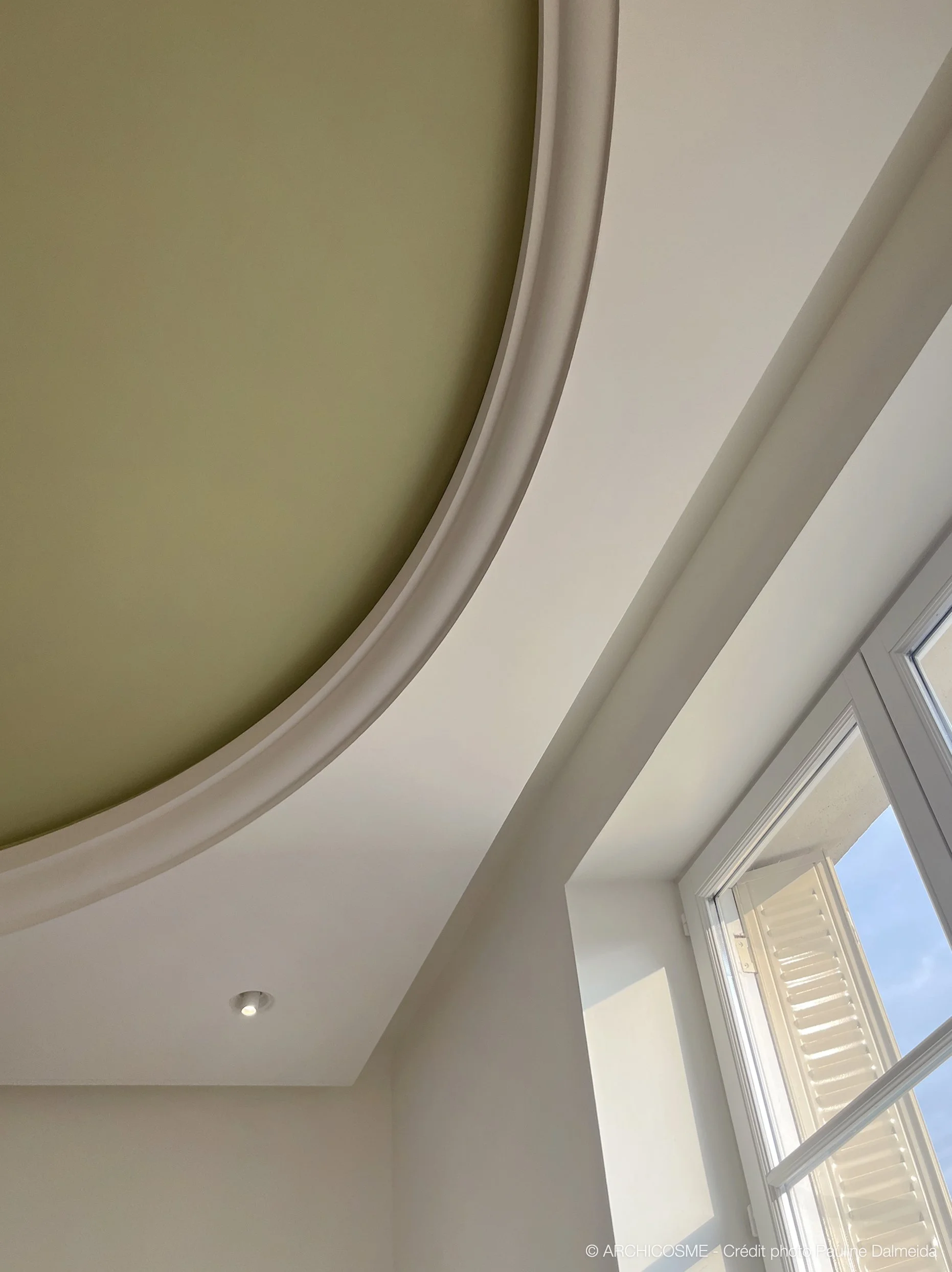Cet appartement de 58 m² a été entièrement repensé pour révéler le potentiel de ses volumes et affirmer une identité singulière. Le dessin du staff en plafond rythme et souligne les pièces, tandis que le choix des couleurs vient dynamiser ce lieu baigné de lumière.